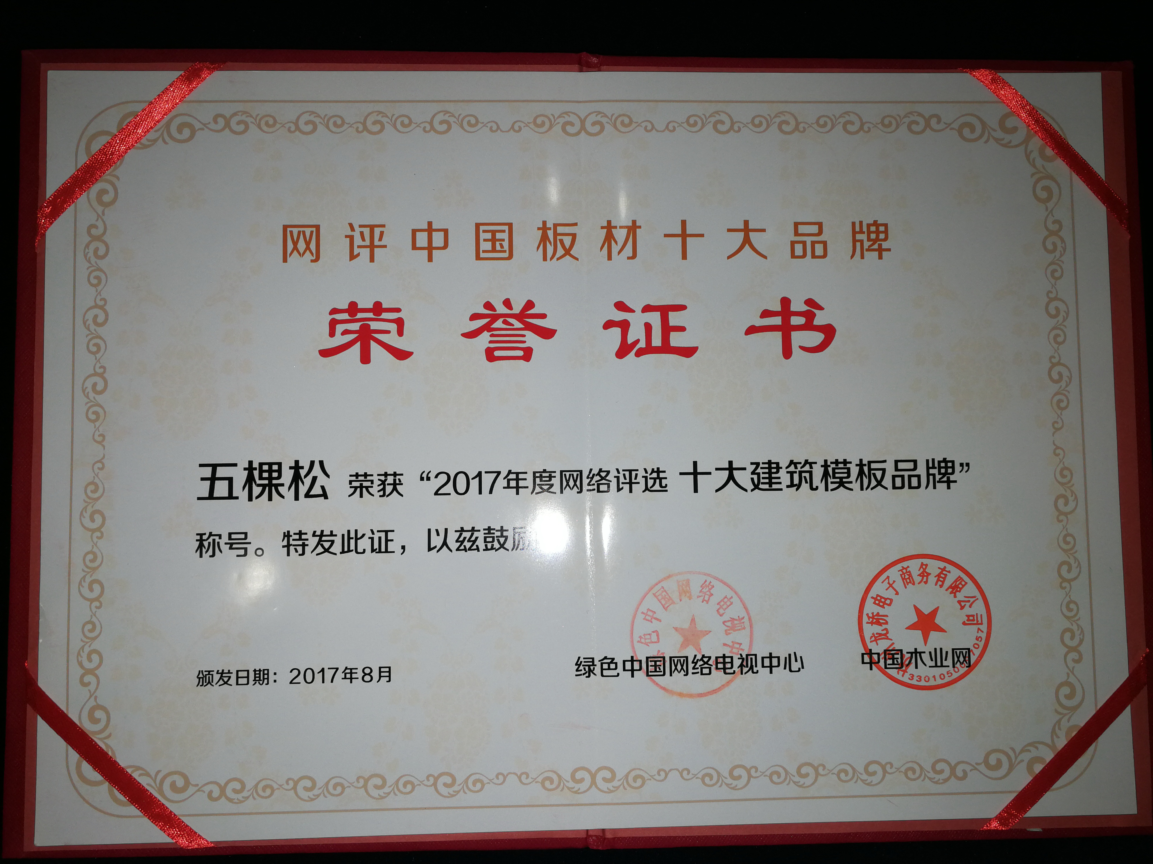 作為中國模板協(xié)會副理事長單位,五棵松在堅(jiān)持自主研發(fā)的道路上帶動了行業(yè)的整體發(fā)展,不僅形成了良性競爭,也推動了建筑模板行業(yè)質(zhì)的飛躍。公司始終注重“質(zhì)量”和“誠信”,將產(chǎn)品質(zhì)量視作企業(yè)發(fā)展的生命線。在全體員工的共同努力下,五棵松逐漸成為行業(yè)內(nèi)的翹楚,各項(xiàng)榮譽(yù)也紛至沓來,公司先后多次榮獲“中國知名品牌”和“信譽(yù)誠信單位”,同時,五棵松被政府部門認(rèn)定為“廊坊市知名商標(biāo)單位”。面對社會給予的各項(xiàng)榮譽(yù),五棵松全體員工依舊保持清醒的認(rèn)識,始終堅(jiān)持“專業(yè)、專注、專心”的工作態(tài)度,保證“精湛、精致、精品”的產(chǎn)品內(nèi)涵,秉承“完備、完善、完美”的服務(wù)宗旨。“五棵松”人將一如繼往地奮進(jìn)不息,為打造中國模板優(yōu)質(zhì)品牌而勇往直前。